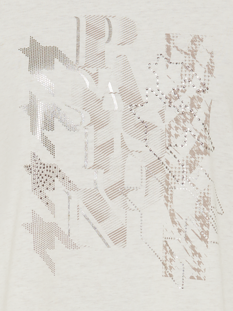 Lightweight cream marled cotton t shirt with long sleeves and round neck.   Lovely dogtooth design in taupe on the front.   Ideal top for under cardigans or suit jackets.   A basic staple for your wardrobe.