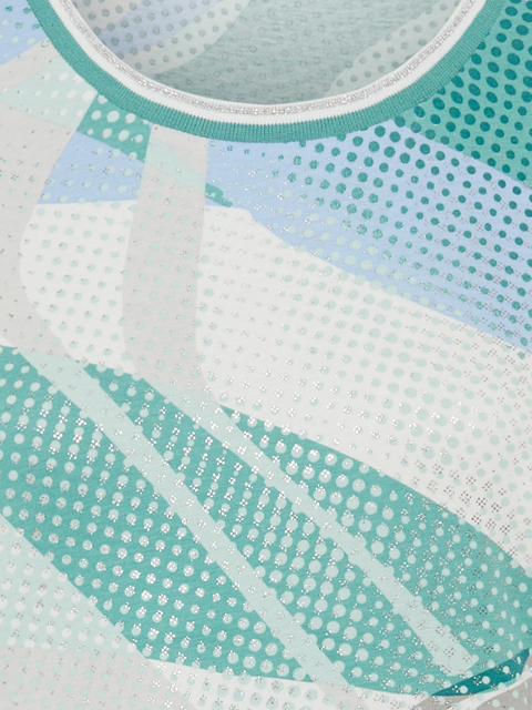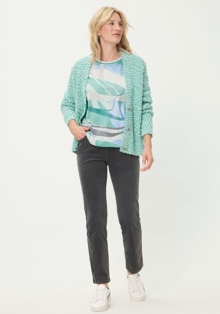 Long sleeved round neck top in shades of mint green and silver. Lovely spot design and looks great under the Olsen zip jacket. Great travel wear with the loungewear grey trousers and jacket. Stand out from the crowd in this beautifully designed top in easy wear fabric.